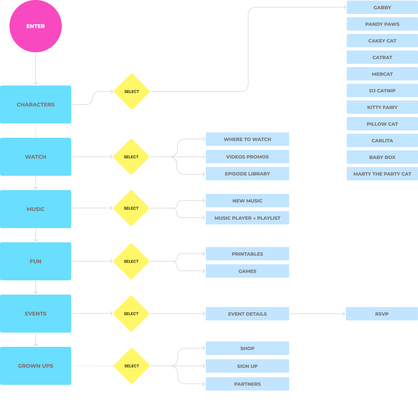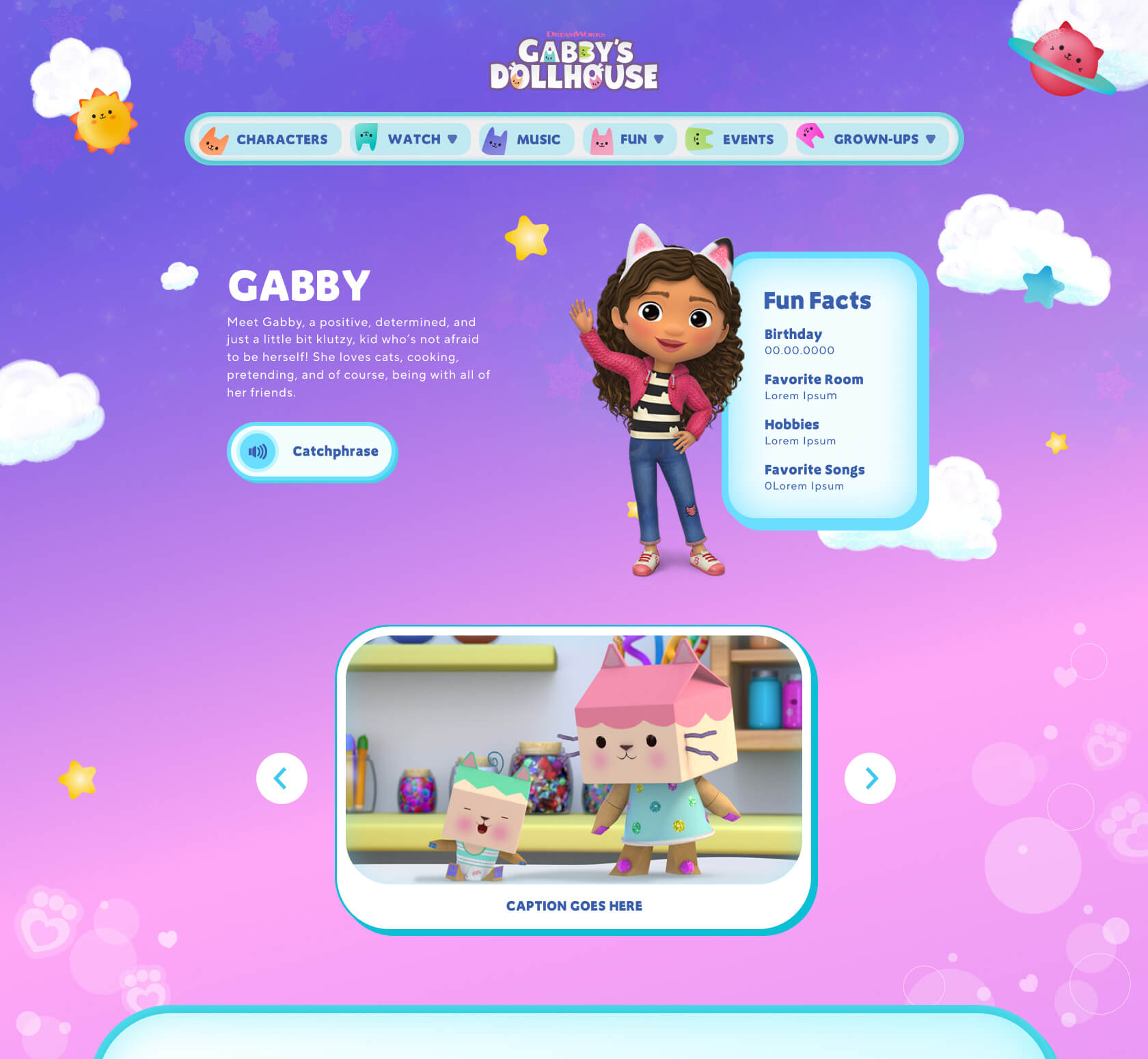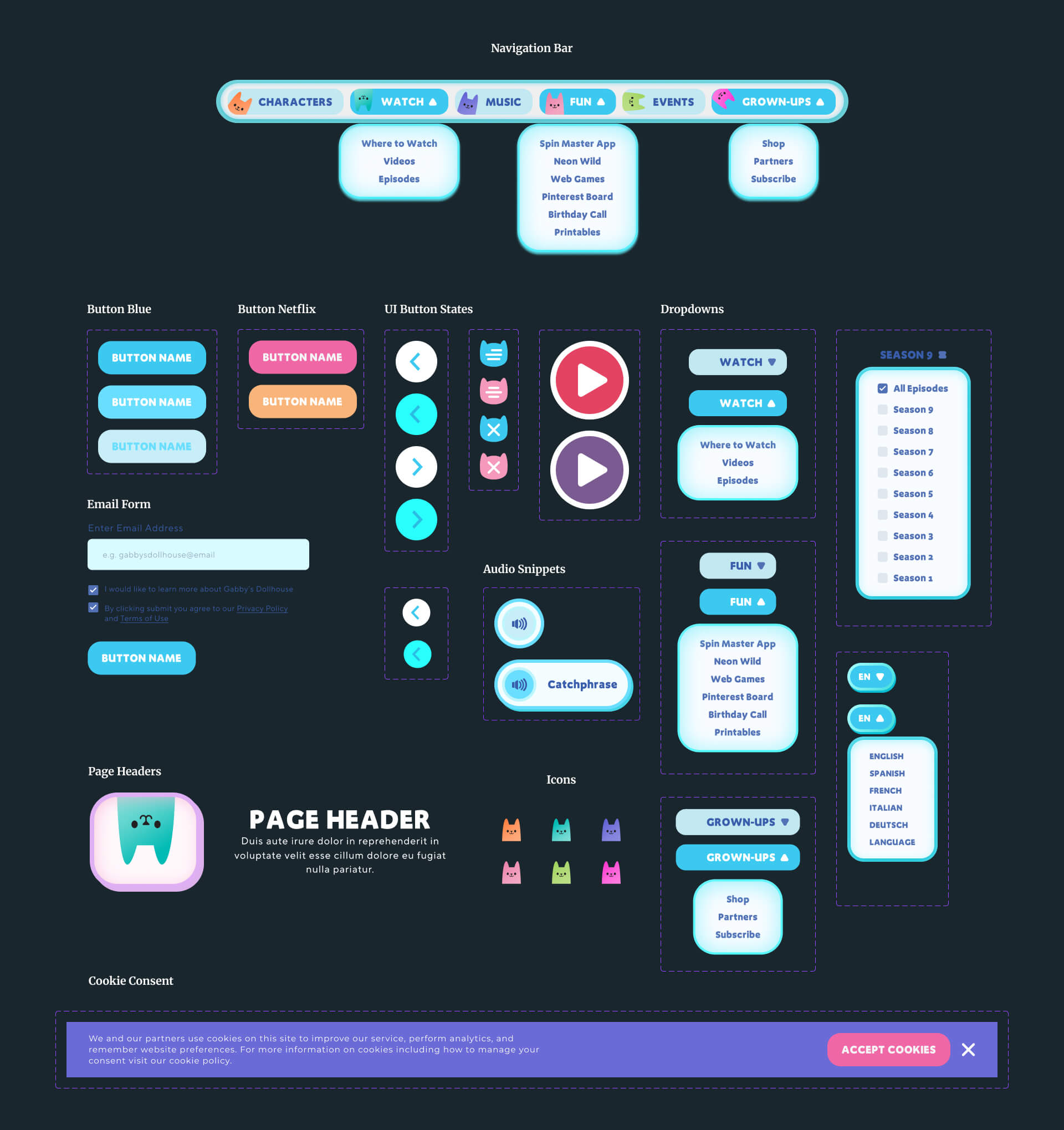 The site needed to strike a balance between playful immersion for kids and functional efficiency for parents, teachers, and content managers, all while reflecting the imaginative spirit of the Gabby’s Dollhouse brand.
