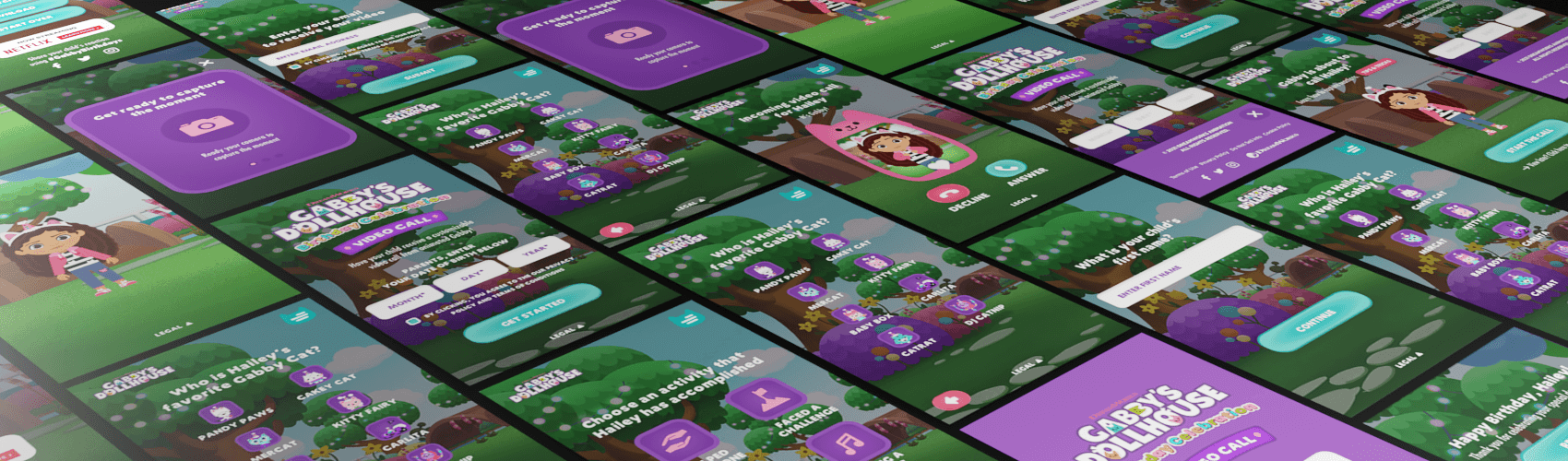 The Gabby’s Dollhouse Video Call's experience was designed to be bright, cheerful, and unmistakably aimed at preschool-aged children and their families with the color palette reflecting the whimsical aesthetic of the Gabby’s Dollhouse brand.