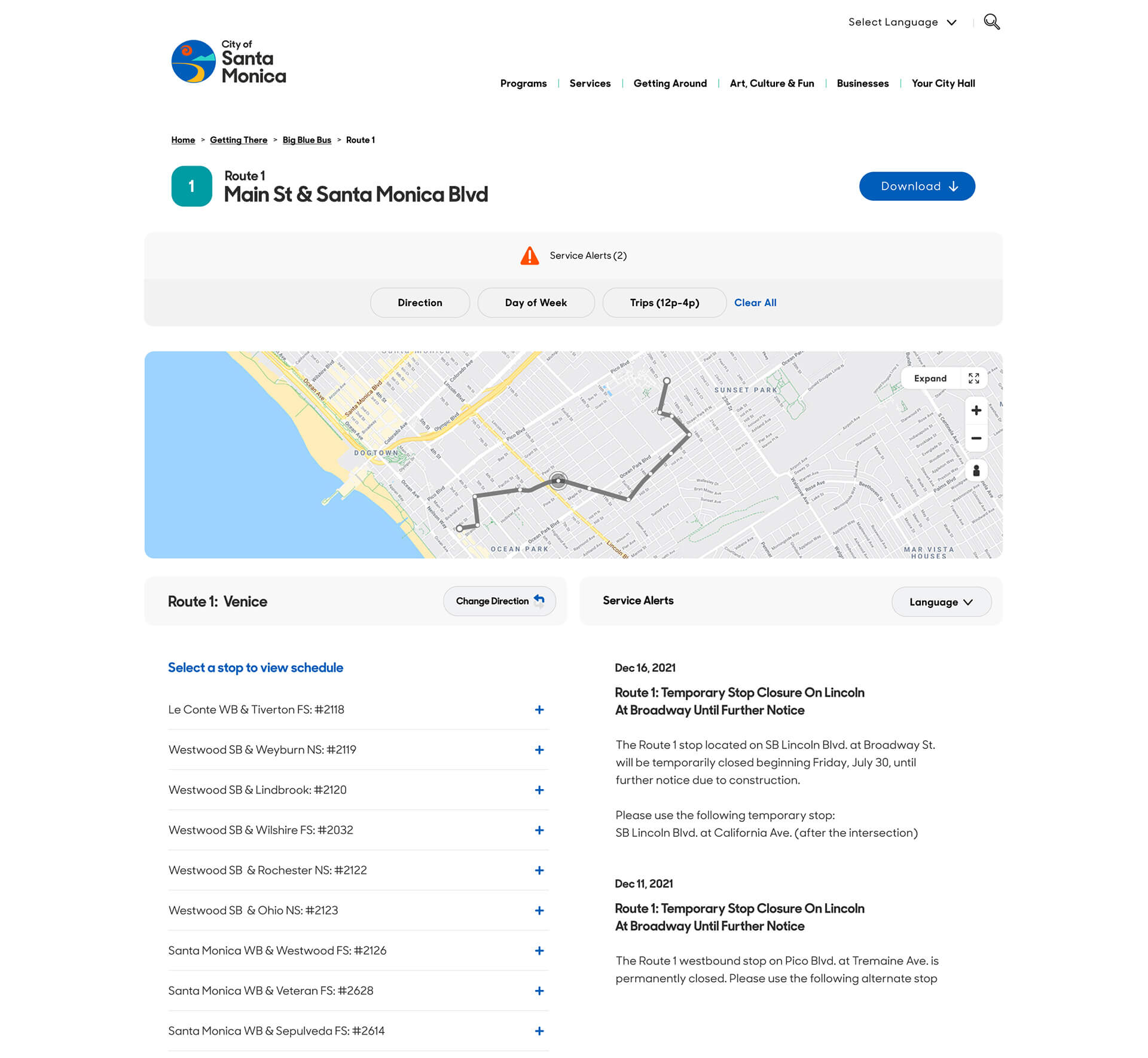 The City of Santa Monica looks at the Big Blue Bus system as a vital transportation lifeline for students, workers, seniors, and environmentally conscious residents. The challenge was to design an integrated digital experience for accessing real-time route information and trip planning tools that meets the needs of its diverse ridership.